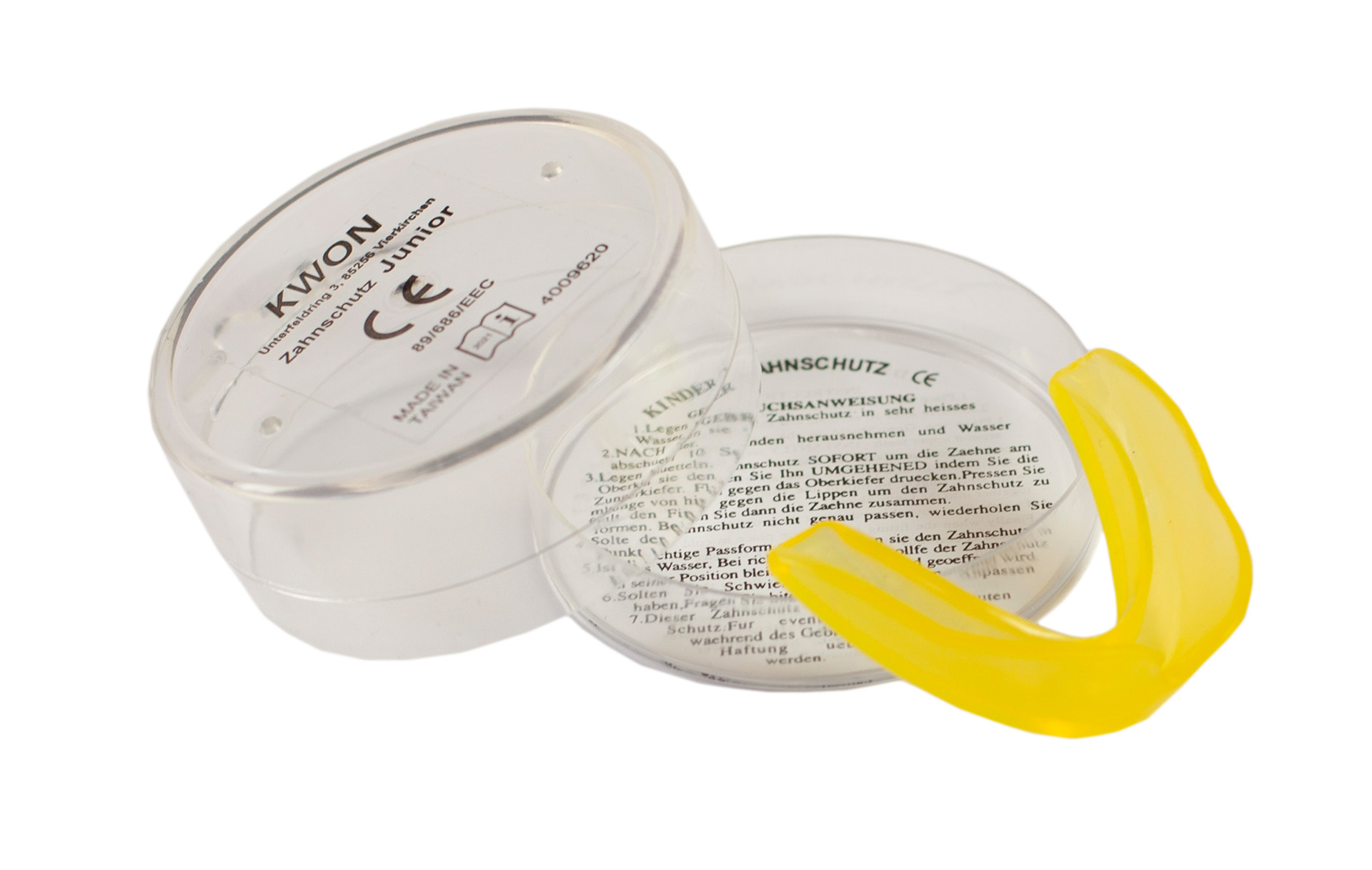 The Junior mouthguard is delivered in a clear KWON plastic box.