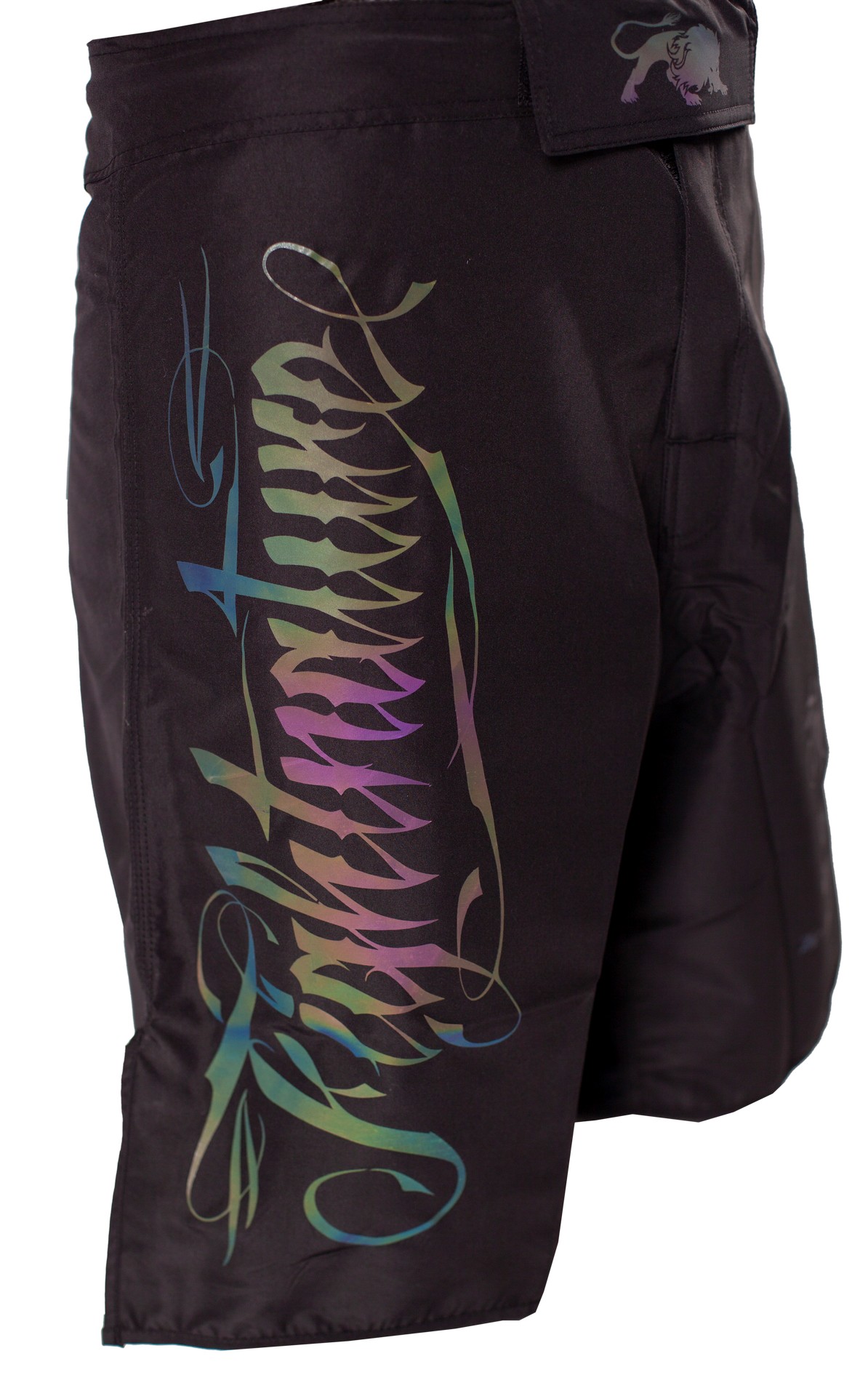 The MMA shorts featuring a reflective FIGHTNATURE print in rainbow colors are eye-catching and very comfortable for training and competition.